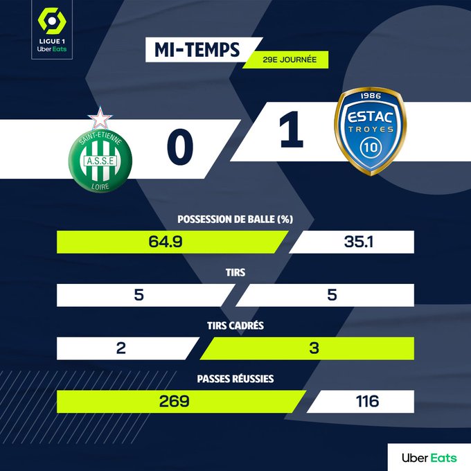 📊 Les chiffres de ces 45 premières minutes entre l'@ASSEofficiel et l'@estac_officiel ➡️ bit.ly/3tmol8d #ASSEESTAC