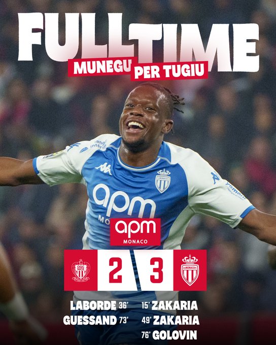 𝗟𝗮 𝗖𝗼̂𝘁𝗲 𝗱'𝗔𝘇𝘂𝗿 𝗲𝘀𝘁 𝗥𝗼𝘂𝗴𝗲 & 𝗕𝗹𝗮𝗻𝗰𝗵𝗲 😍🔚 Grâce à un magnifique doublé de Denis Zakaria et à un but de Golovin, l'AS Monaco s'impose sur la pelouse du voisin niçois 👊 𝗗𝗔𝗚𝗛𝗘 𝗠𝗨𝗡𝗘𝗚𝗨 ❤️🤍 2⃣-3⃣ #OGCNASM