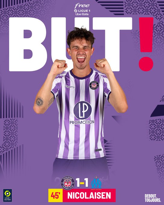 ⏱️ 45'+ ⚽️ Rasmus s'envole dans le ciel du Stadium et égalise de la tête sur corner ! Retrouvez gratuitement ce but sur l’app @FreeLigue1 bit.ly/FreeL1 1-1 #TFCOM