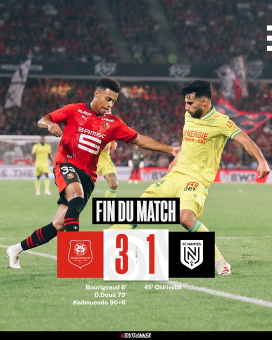 🏁 C'est terminé ! Les Rouge et Noir auront su montrer du caractère pour s'imposer dans un Roazhon Park bouillant. 𝗟𝗲 𝗱𝗲𝗿𝗯𝘆 𝗲𝘀𝘁 𝗥𝗼𝘂𝗴𝗲 𝗲𝘁 𝗡𝗼𝗶𝗿 ! 🔴⚫️ #SRFCFCN 3-1