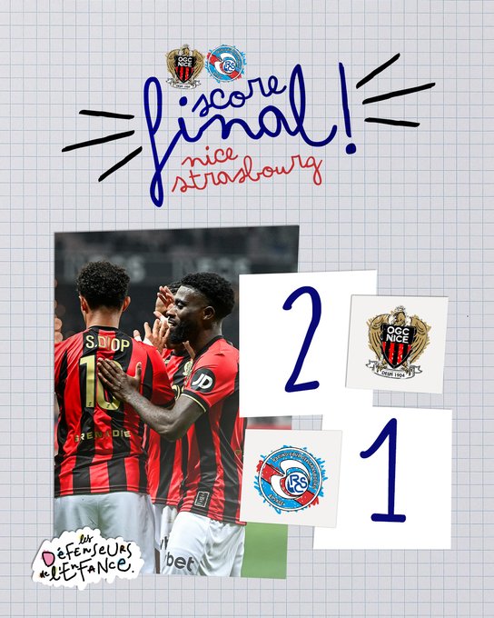 Buts : Bard (54e), Sylla contre son camp (62e) pour Nice ; Bakwa (20e) pour Strasbourg.