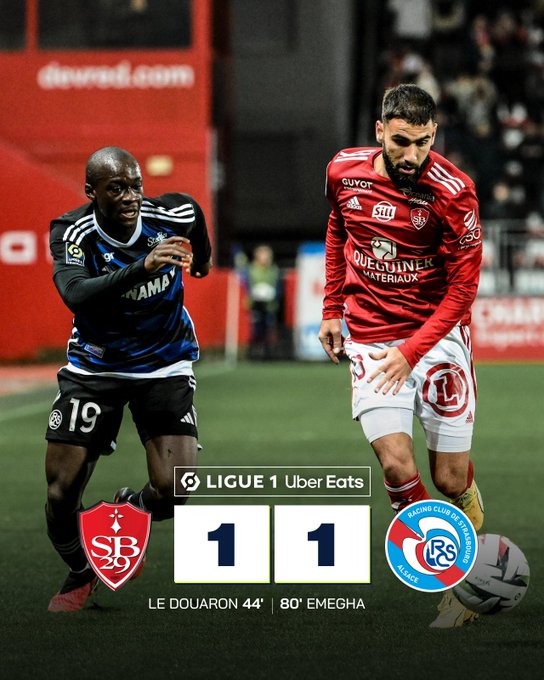 Reporté suite aux dégâts causés par la tempête Ciaran en novembre dernier, ce match entre Brest et Strasbourg a accouché d’un match nul. Suite à un but de Le Douaron juste avant la mi-temps (44e), le Racing a répondu en fin de match avec une réalisation d’Emegha sur un très bon service de Dion (80e).