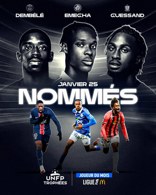 Ils ont démarré l’année 2025 sur des chapeaux de roues : Ousmane Dembélé 🔴🔵 Emanuel Emegha 🔵⚪️ Evann Guessand 🔴⚫️ Ils sont nommés pour le Trophées UNFP du Joueur du Mois de janvier de @Ligue1 🏆 Votez pour votre favori sur : tropheesunfp.com 🗳️ #tropheesunfp