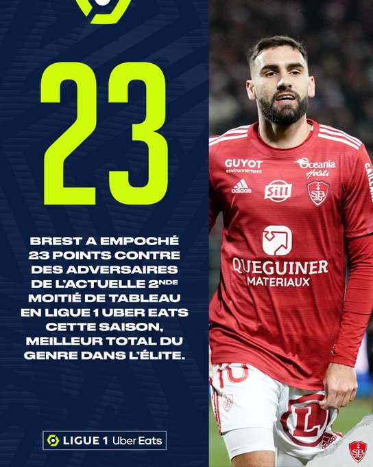 La composition du Stade Brestois : Bizot - Lala, Chardonnet, Brassier, Locko - Lees-Melou, Magnetti, Camara - Del Castillo, Mounié, Pereira Lage