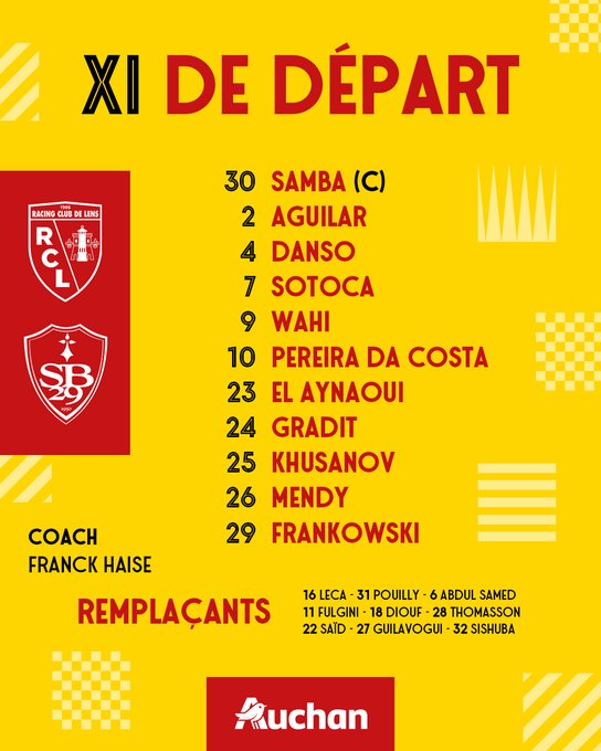 H-1 avant #RCLSB29 ! ⌛️ Voici 𝐥𝐞𝐬 1⃣1⃣ 𝐒𝐚𝐧𝐠 𝐞𝐭 𝐎𝐫 qui débuteront la rencontre face au @SB29 ! 👊 ➡️ Abdukodir Khusanov intègre la défense sang et or. #FierDEtreLensois