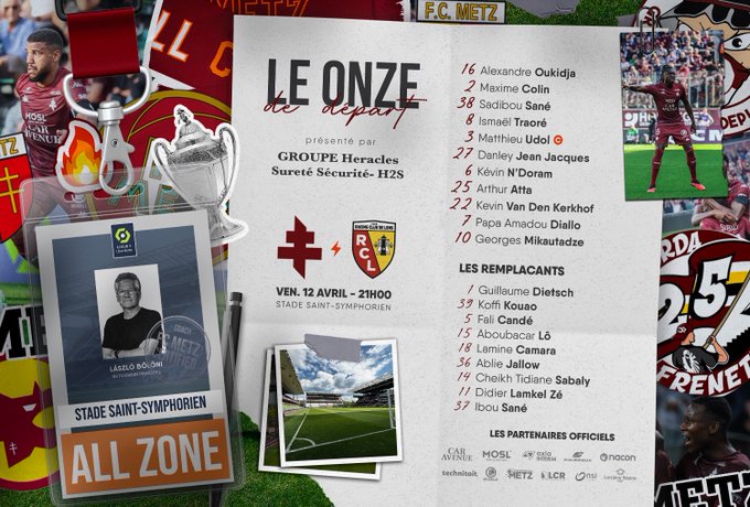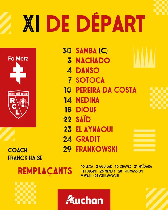 H-1 avant #FCMRCL ! 🔥 Voici 𝐥𝐞𝐬 1⃣1⃣ 𝐒𝐚𝐧𝐠 𝐞𝐭 𝐎𝐫 choisis par Franck Haise pour débuter cette rencontre face au @FCMetz en @Ligue1UberEats ! 👊 🔙 Pour la première fois depuis décembre, Deiver Machado figure dans l'équipe de départ ! #FierDEtreLensois