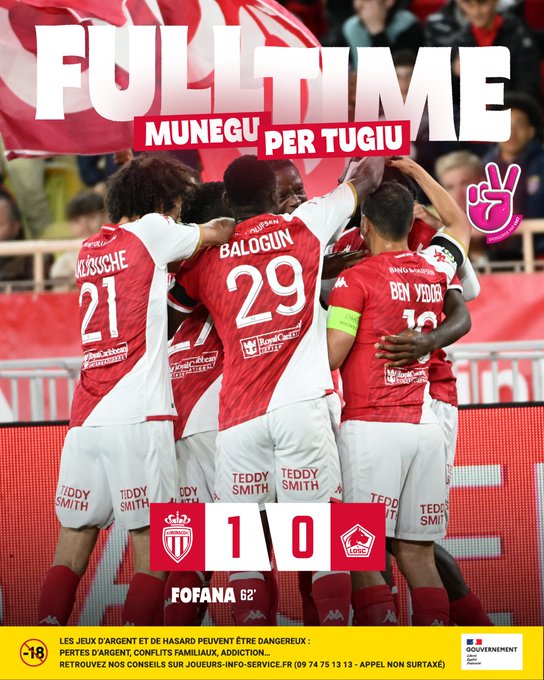 𝗩𝗜𝗖𝗧𝗢𝗜𝗥𝗘 🔥🔥🔥 L'AS Monaco s'impose face à Lille et fait un pas de plus dans la course à la Ligue des Champions 👊 𝗗𝗔𝗚𝗛𝗘 𝗠𝗨𝗡𝗘𝗚𝗨 ❤️🤍 1⃣-0⃣ #ASMLOSC