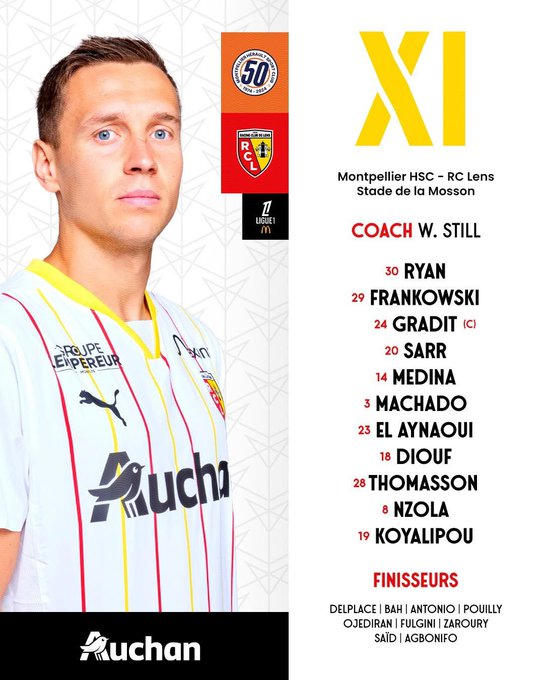 𝑯-𝟏 avant #MHSCRCL 🔴🟡 Voici 𝒍𝒆 𝒐𝒏𝒛𝒆 𝒔𝒂𝒏𝒈 𝒆𝒕 𝒐𝒓 choisi par Will Still pour débuter cette rencontre de Ligue 1 face au Montpellier HSC ! 🔙 Deiver Machado et Andy Diouf réintègrent l'équipe de départ.