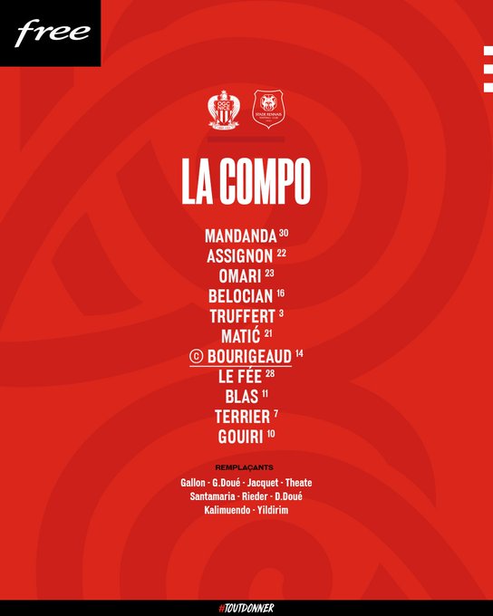 👥 Le XI Rouge et Noir pour affronter l'OGC Nice. 👊 #OGCNSRFC