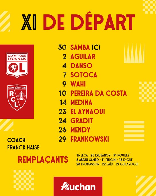 #OLRCL débute dans une heure ! ⌛️ Voici 𝐥𝐞𝐬 1⃣1⃣ 𝐒𝐚𝐧𝐠 𝐞𝐭 𝐎𝐫 choisis par Franck Haise pour débuter cette rencontre de la 2⃣4⃣e journée de @Ligue1UberEats face à l’@OL ! 👊 #FierDEtreLensois