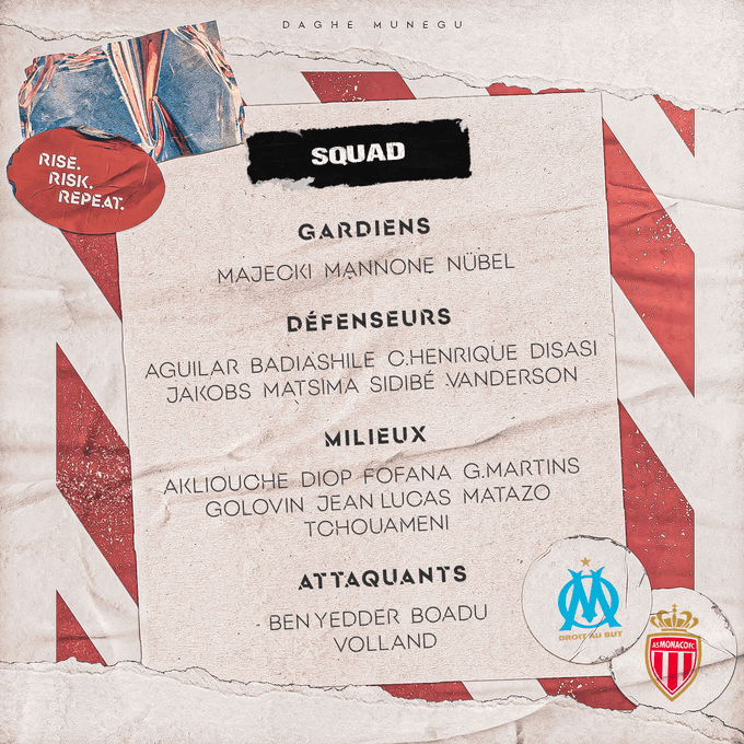 👥 𝗟𝗲 𝗴𝗿𝗼𝘂𝗽𝗲 retenu par le coach Sampaoli pour la réception de l’AS Monaco, demain à 20h45 à l’@orangevelodrome ! 🔜 #OMASM