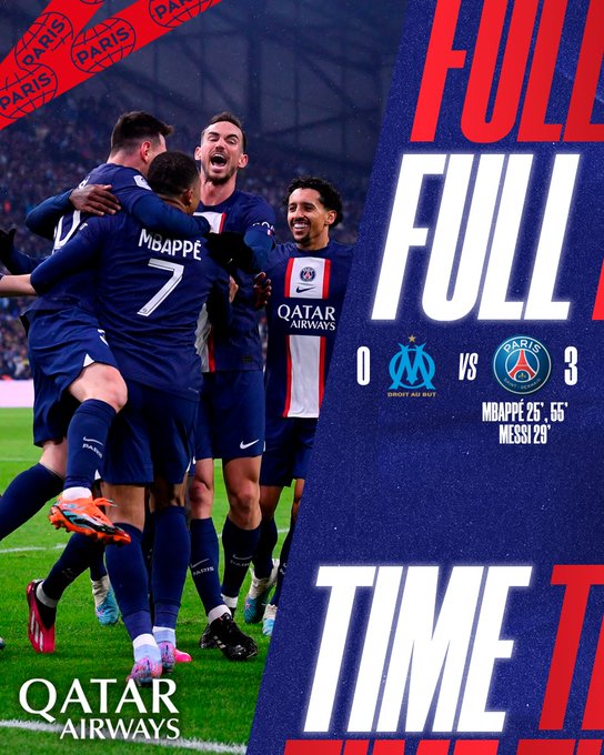 ⌛️ C'est fini à Marseille ! Nos Parisiens remportent #LeClassique et décrochent les 3 points ! ❤️💙 ⚽️ @KMbappe 25', 55' ⚽️ Messi 29' 0-3 I #OMPSG I #LeClassique
