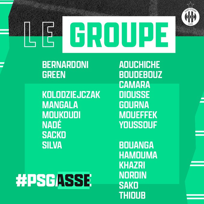 La compo probable de l’ASSE : Bernardoni - Sacko, Mangala, Nadé - Thioub, Youssouf, Camara, Kolodziejczak - Boudebouz - Bouanga, Khazri.
