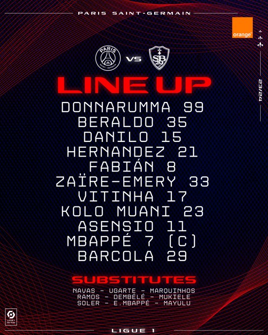 La compo du Paris Saint-Germain : Donnarumma - Zaïre-Emery, Beraldo, Danilo Pereira, Lucas Hernandez - Ruiz, Vitinha - Asensio, Mbappé, Kolo Muani, Barcola.