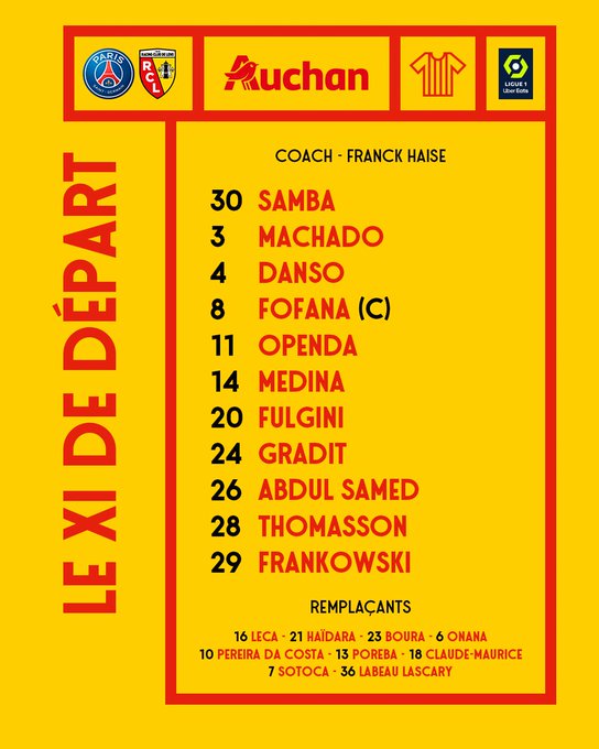 #PSGRCL, c'est dans une heure 🔥 Découvrez 𝐥𝐞 1⃣1⃣ 𝐬𝐚𝐧𝐠 𝐞𝐭 𝐨𝐫 concocté par Franck Haise pour débuter la rencontre face au @PSG_inside ! ➡️ Deiver Machado retrouve une place de titulaire dans le dispositif lensois. #FierDEtreLensois