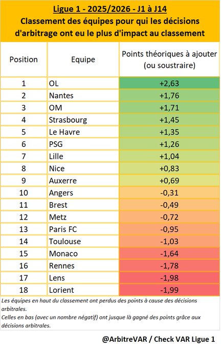 🚨 EXCLUSIF - Mise à jour J14 Classement des équipes de @Ligue1 ayant subi les erreurs d’arbitrages les plus impactantes au classement. Uniquement sur cette J14, le podium est : 🥇 @PSG_inside 🥈 @OM_Officiel 🥉 @RCSA Détails en commentaire 👇
