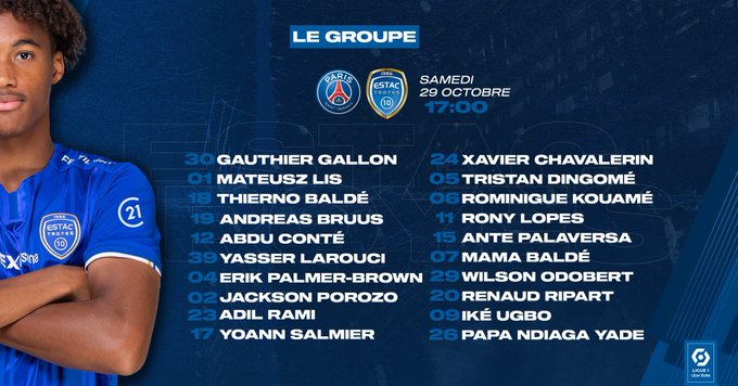 La compo probable de Troyes : Lis – Thierno Baldé, Porozo, Palmer-Brown, Salmier, Conte – Lopes, Kouamé, Chavalerin, Odobert – Mama Baldé.