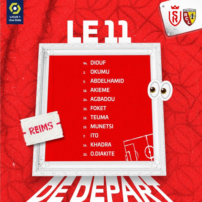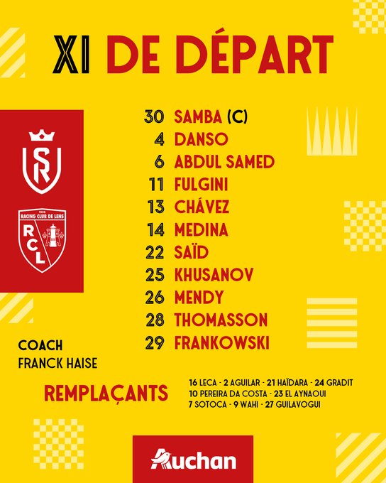 #SDRRCL débute dans une heure ! ⌛️ Voici 𝐥𝐞𝐬 1⃣1⃣ 𝐒𝐚𝐧𝐠 𝐞𝐭 𝐎𝐫 qui débuteront cette rencontre de @Ligue1UberEats sur la pelouse du @StadeDeReims ! 👊 ➡️ Franck Haise procède à 8⃣ changements par rapport au match européen disputé cette semaine. #FierDEtreLensois