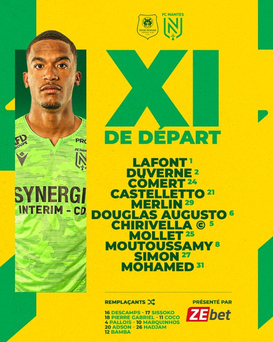 👥 La composition des Rouge et Noir pour le derby. 🔴⚫️ Le match en quasi-direct et tous les buts gratuitement sur l’application @FreeLigue1 👉 bit.ly/FreeL1 #SRFCFCN