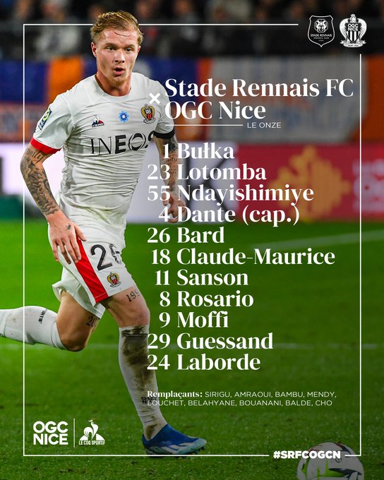 Le 1️⃣1️⃣ de l'#OGCNice pour défier le @staderennais au Roazhon Park #SRFCOGCN #IssaNissa