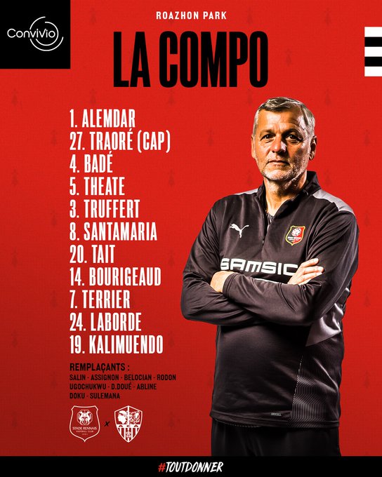 [#SRFCACA] 👥 𝗟𝗲 𝗫𝗜 𝗱𝗲 𝗱𝗲́𝗽𝗮𝗿𝘁 𝗥𝗼𝘂𝗴𝗲 𝗲𝘁 𝗡𝗼𝗶𝗿 👊 --- #AllezRennes #ToutDonner 💪🔴⚫