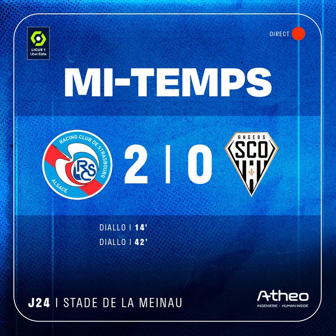 ⏸️ C'est la mi-temps ! Le Racing mène de 2 buts dans cette 1ère période très bien maitrisée ! Il reste 45 minutes pour confirmer ! #RCSASCO (2-0)