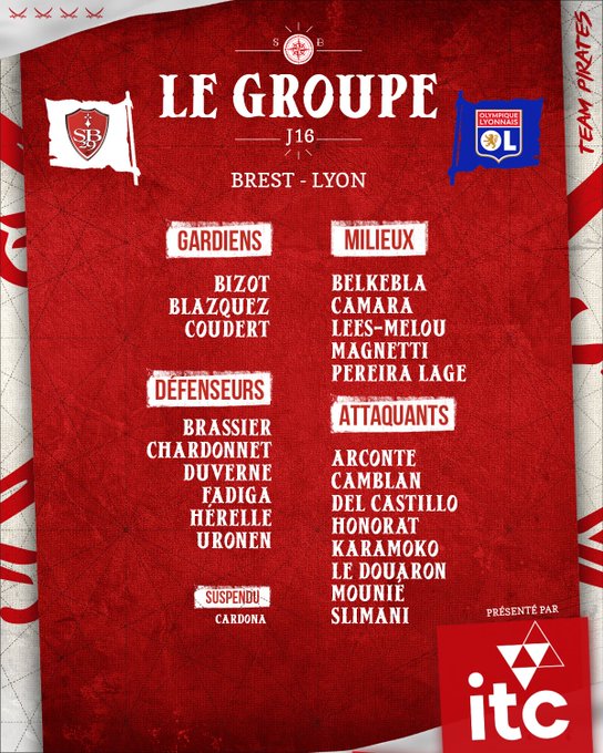 La compo probable de Brest : Bizot - Fadiga, Chardonnet, Brassier, Duverne - Del Castillo, Camara, Belkebla, Lees Melou - Honorat - Mounie.