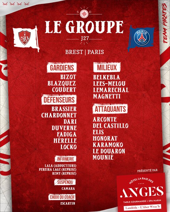 📋 Découvrez le groupe de 𝟮𝟭 𝗕𝗿𝗲𝘀𝘁𝗼𝗶𝘀 pour la réception du Paris Saint-Germain ce samedi à 21h 👇 #SB29PSG | #AllezBrest 🔴⚪⚔
