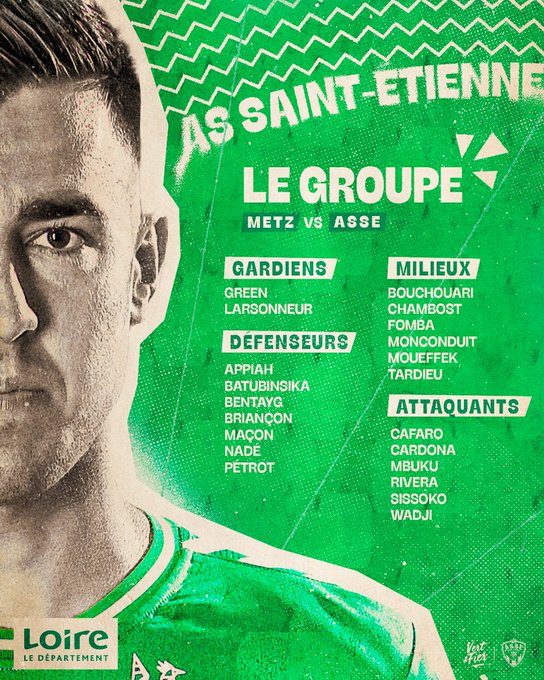 👥 Les 21 Verts pour #FCMASSE (dimanche, 17h) ! Un seul changement avec Ibrahima Wadji qui intègre le groupe pour ce barrage retour ! 👊💚