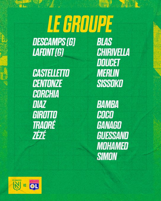 La compo probable de Nantes : Lafont - Centonze, Castelletto, Girotto, Merlin - Guessand, Sissoko, Chirivella, Blas - Simon, Mohamed.