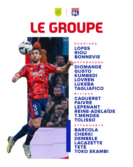 Qualifié pour les 16es de finale de la Coupe de France, avec un match à Chambéry (N3) à disputer mi-janvier, l’OL doit reprendre sa marche en avant en L1 après sa défaite contre Clermont le 1er janvier dernier (0-1). Pour remonter au classement et viser un éventuel Top 5, Lyon va donc devoir ramener un bon résultat de Nantes. Pour cela, Laurent Blanc sera privé d’Aouar et Henrique. Concernant, Gusto, Lovren, Tolisso ou Tagliafico, ils sont dans le groupe sans l’assurance d’être titulaires. La compo probable de l’OL : Lopes - Gusto, Diomandé, Lukeba, Tagliafico - Thiago Mendes, Caqueret - Tete, Cherki, Toko Ekambi - Lacazette.