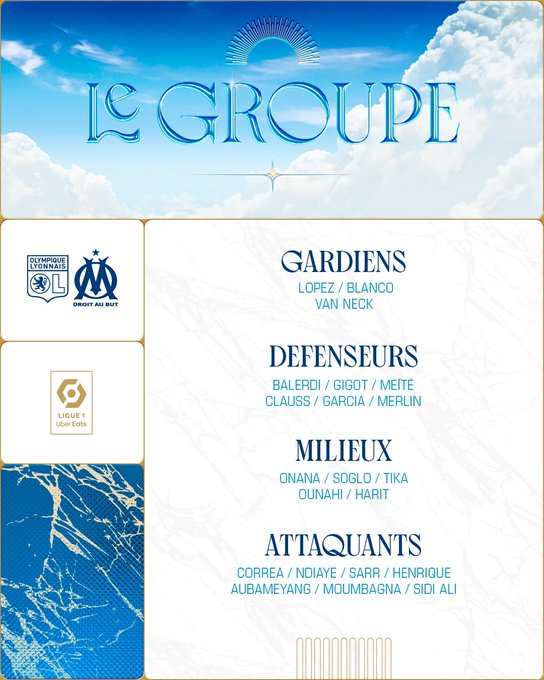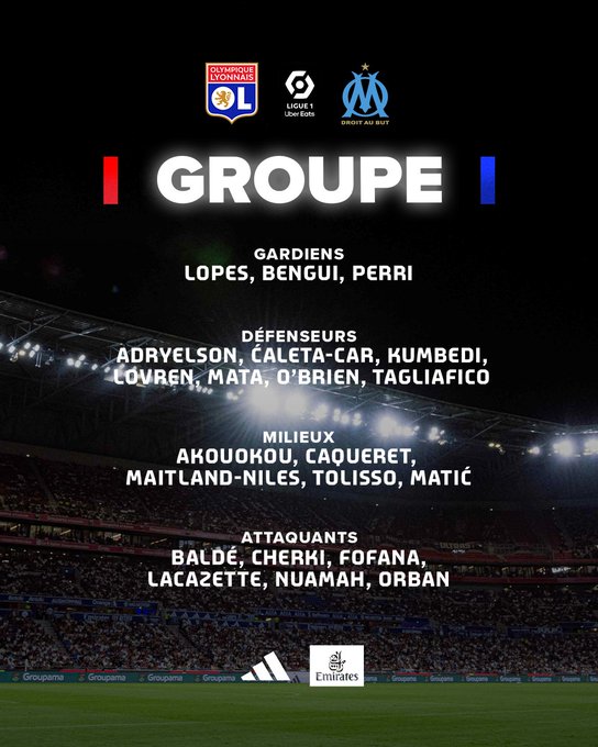 🦁 Voici notre 𝗴𝗿𝗼𝘂𝗽𝗲 convoqué pour la réception de Marseille, ce soir à 20h45 au @GroupamaStadium 🔴🔵 #OLOM