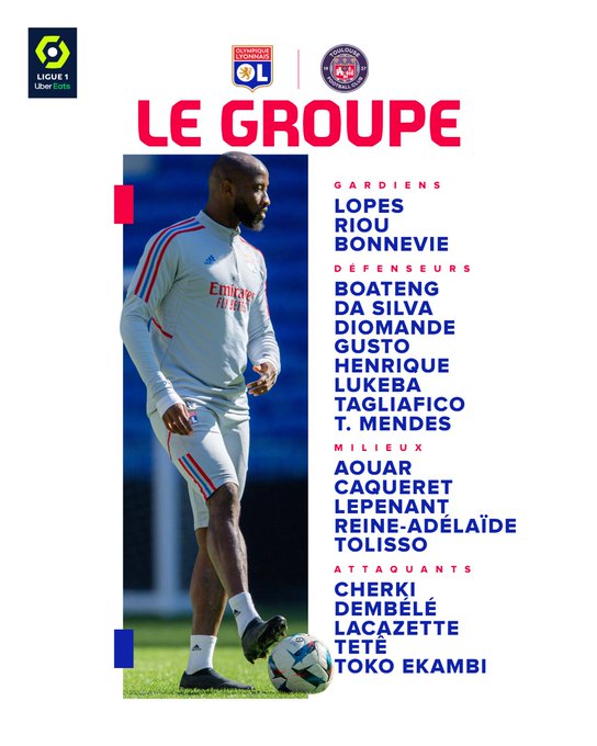 🦁 Nos 2⃣1⃣ 𝗟𝘆𝗼𝗻𝗻𝗮𝗶𝘀 convoqués pour la réception du Toulouse FC, ce vendredi à 21h au @GroupamaStadium 🔴🔵 #OLTFC