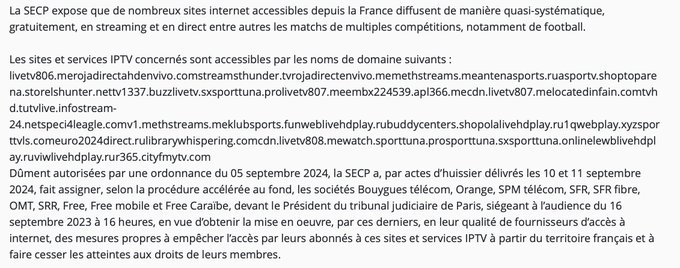 Piratage des compétitions sportives : @canalplus obtient une nouvelle salve de décisions de déréférencement & blocage de sites #IPTV (TJ Paris, 10/10/2024) courdecassation.fr/recherche-judi…