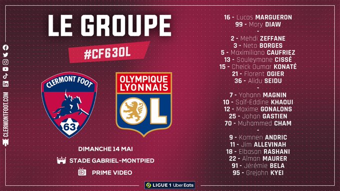 📋 #CF63OL Le 𝗴𝗿𝗼𝘂𝗽𝗲 𝗰𝗹𝗲𝗿𝗺𝗼𝗻𝘁𝗼𝗶𝘀 pour la réception de Lyon, ce dimanche à 13h ⚔️
