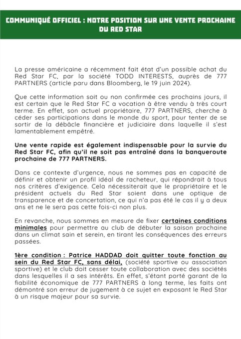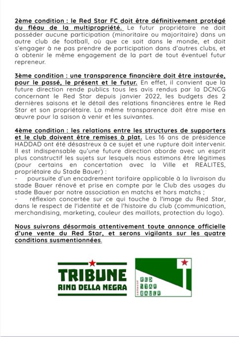 📝NOTRE POSITION SUR UNE VENTE PROCHAINE DU RED STAR📝 La tribune Rino Della Negra souhaite fixer des conditions minimales à respecter pour un rachat du club imminent. Le détail est a consulter dans le communiqué ci-dessous : ⬇️⬇️⬇️ #777OUT
