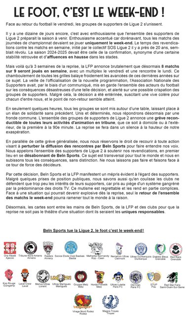 COMMUNIQUÉ COMMUN GROUPES DE SUPPORTERS DE L2 BeIn Sports tue la Ligue2 Le foot, c’est le week-end ! Pétition : change.org/p/non-%C3%A0-l…