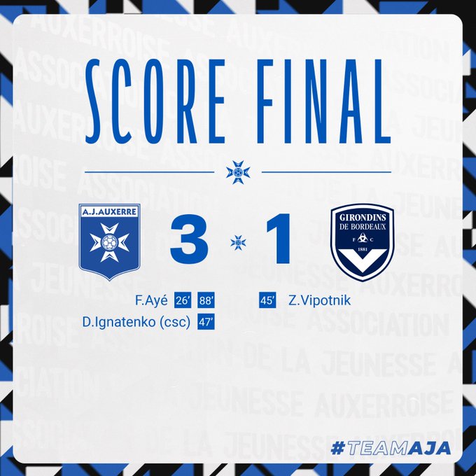 🔚 𝐕𝐈𝐂𝐓𝐎𝐈𝐑𝐄!!!!! 🔥 L’AJA s’impose logiquement face à Bordeaux, enchaîne une 5e victoire consécutive en @Ligue2BKT et prend la tête du classement ! La soirée parfaite ! 🥳🎉 #TeamAJA #AJAFCGB (3-1)