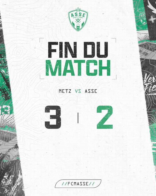 90e+5 : ⏹️ Fin du match. Les Verts s'inclinent à Metz. 🔴 3-2 🤍 #FCMASSE