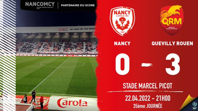 #ASNLQRM Une infinie tristesse ! Suite aux fumigènes envoyés par les supporters, la rencontre a été définitivement arrêtée à la 40ème minute. L’#ASNL évoluera en National la saison prochaine. 💡 @NANCOMCY1, partenaire du score ➡ bit.ly/37wybwd