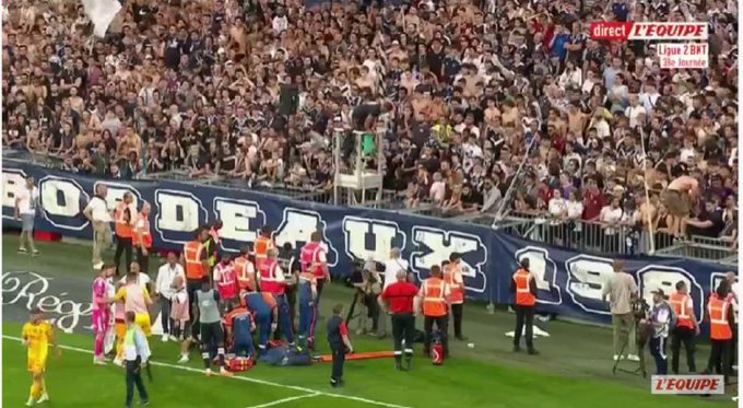 🚨 Après le but de Rodez à Bordeaux, Buades, le buteur, est poussé par un « supporter » de Bordeaux entré sur le terrain. Le match est actuellement arrêté le temps que le joueur de Rodez soit pris en charge par les services médicaux.