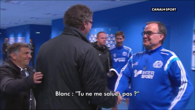 Comme souvent, les caméras de Canal+ trainaient un peu partout dans les coursives du Vélodrome ce dimanche soir pour le grand match face à l’OM. Et cela a donné lieu à une scène cocasse entre Laurent Blanc et Marcelo Bielsa. L’entraineur argentin de l’OM est en effet passé dans les couloirs du Vélodrome juste devant le coach du PSG, sans le voir et donc sans le saluer. Le champion du monde 1998 n’en a pas pris ombrage, interpellant son homologue avec le sourire en lui demandant « Tu ne me salues pas ? ». Pas désarçonné pour un sou, El Loco a chaleureusement salué Blanc, expliquant avec un doigt tourniquant sur la tempe, qu’il pouvait mettre cet oubli sur le compte de sa folie, lui que l’on surnomme bien évidemment « Le Fou ». On a déjà vu pire comme scène dans les couloirs du Vélodrome lors d’un gros match…