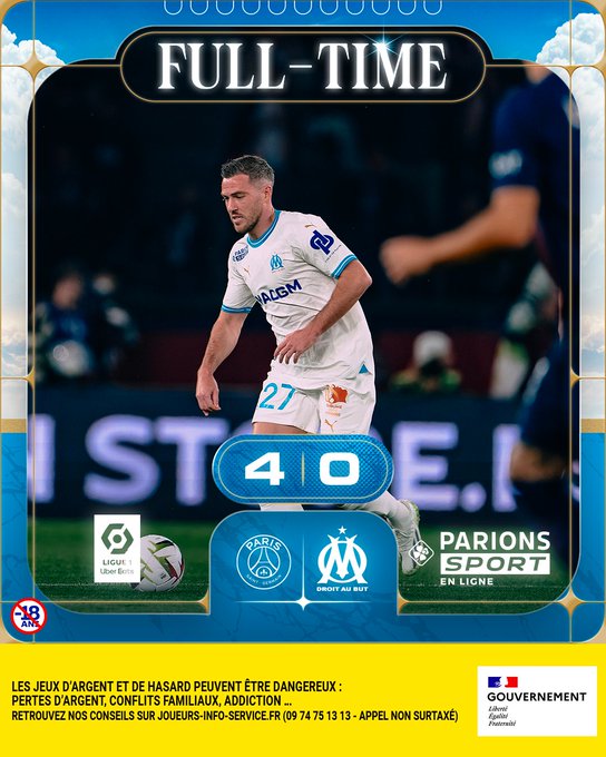 ⏱ 90’ | #PSGOM 4️⃣-0️⃣ Nos Olympiens s’inclinent à Paris. 📅 Prochain match : samedi à Monaco pour la J7 de @Ligue1UberEats