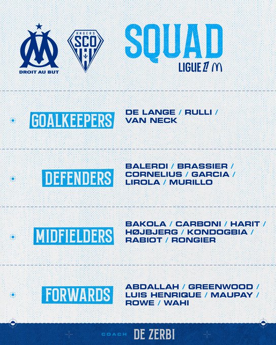 👥 𝗟𝗘 𝗚𝗥𝗢𝗨𝗣𝗘 ⚔️ #OMSCO Voici les 2️⃣2️⃣ joueurs retenus par coach 𝗗𝗲 𝗭𝗲𝗿𝗯𝗶 🇮🇹, pour la réception d'Angers SCO ce soir à l'@orangevelodrome ! 💪