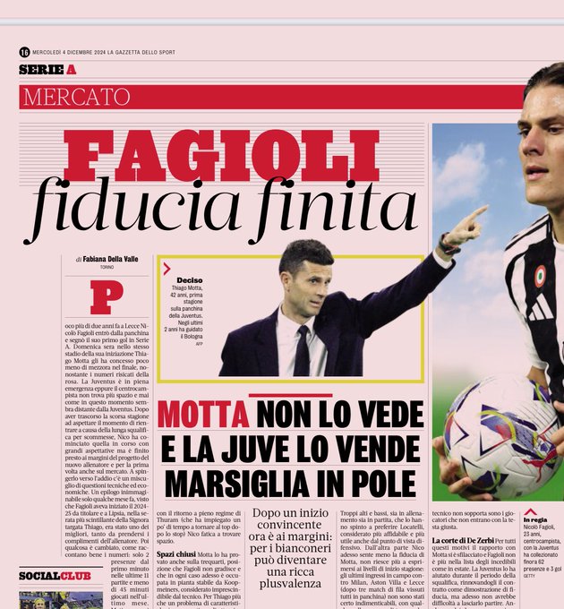 Le tandem Longoria-Benatia pourrait tout faire pour permettre à Roberto De Zerbi de bénéficier de Nicolò Fagioli dans son effectif. Le technicien italien apprécie particulièrement son profil et pense qu'il s'adaptera à son système de jeu. Plusieurs clubs de Premier League, le Napoli et surtout le Paris Saint-Germain, sont en concurrence pour s'adjuger ses services, mais la presse italienne précise bien que ce sont les Phocéens qui ont de l'avance.