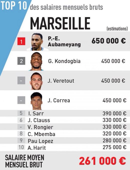 Ce jeudi 21 mars, le journal l’Équipe a dévoilé les salaires des joueurs de la Ligue 1, et notamment ceux des Marseillais. Avec 650 000 euros mensuels bruts, Pierre-Emerick Aubameyang est logiquement le joueur le mieux payé de l’effectif phocéen. En deuxième position, à égalité avec Jordan Veretout et Geoffrey Kondogbia, il s’agit de Joaquín Correa, avec un salaire de 450 000 euros mensuels bruts. Arrivé cet été à l’