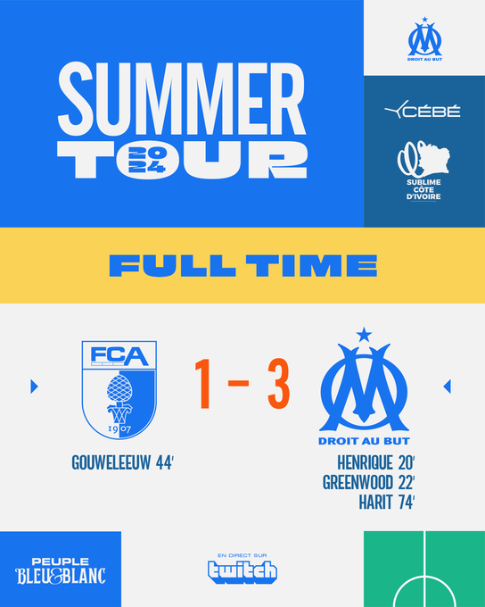 Buts : Gouweleeuw (45e) pour Augsburg; Luis Henrique (20e), Greenwood (21e), Harit (74e) pour l'OM
