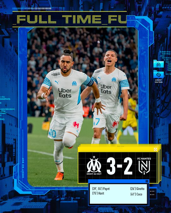 ⏱ 90’ | #OMFCN 3️⃣-2️⃣ 𝑭𝑰𝑵 𝑫𝑼 𝑴𝑨𝑻𝑪𝑯 ! 🤯 Après avoir été menés deux fois au score, nos Olympiens s’imposent 3️⃣-2️⃣ grâce à des buts de @dimpayet17 et @Amine_000 🔵⚪️