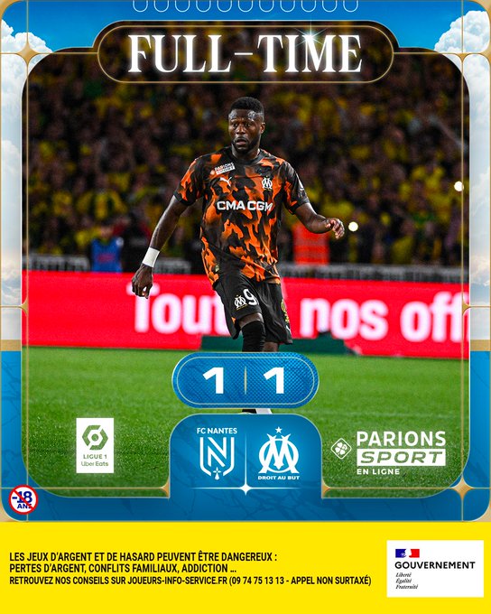 ⏱ 90’⎪#FCNOM 1️⃣-1️⃣ 🏁 Fin du match Les deux équipes se partagent un point. 📅 Rendez-vous après la trêve internationale pour la réception de Toulouse à l’@orangevelodrome. 🏟