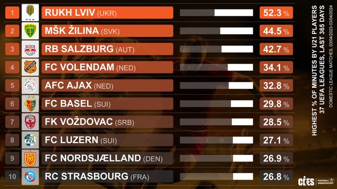 🔝 % U2⃣1⃣ players' minutes (last 365 days), 3⃣7⃣ European leagues 🥇 #RukhLviv 🇺🇦 52.3% 🥈 #MSKZilina 🇸🇰 44.5% 🥉 #RBSalzburg 🇦🇹 42.7% #FCVolendam 🇳🇱 #AFCAjax 🇳🇱 #FCBasel 🇨🇭 #FKVozdovac 🇷🇸 #FCLuzern 🇨🇭 #FCNordsjaelland 🇩🇰 Full @CIES_Football analysis 👉 football-observatory.com/WeeklyPost458